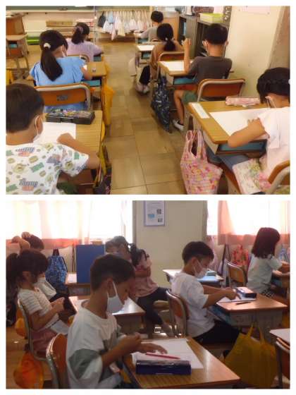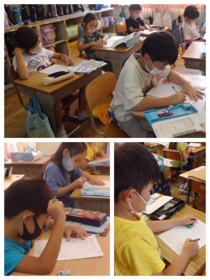 (写真上)1年1組の様子です。マス計算にチャレンジ。以前よりも素早くできたかな?