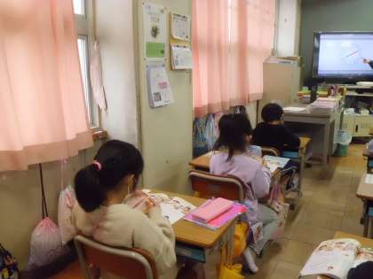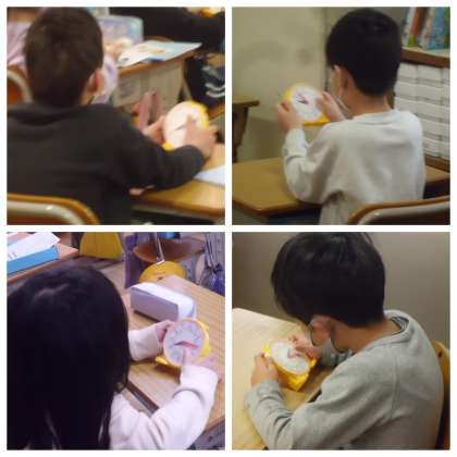 1年1組の算数では、〇時〇〇分というような時刻の表し方を模型の時計を用いて学習していました。時計マスターをめざしてくださいね。