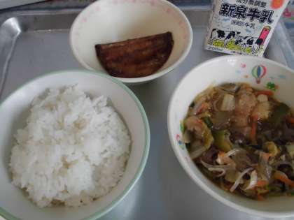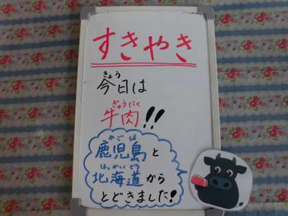 いつもは豚肉で作るすき焼き風煮ですが、今日は牛肉を使いました。堺市産の春菊も使っています。子どもたちの中には、牛肉を朝から楽しみにしてくれていた人もいるようでした。