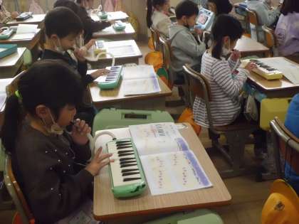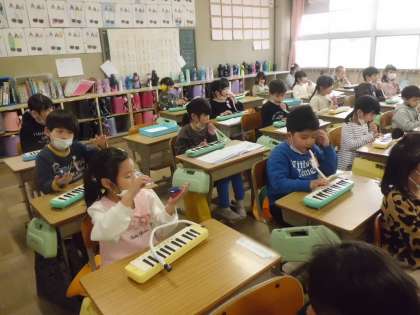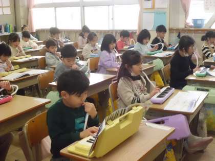 鍵盤ハーモニカで「きらきらぼし」を演奏していました。よく音がそろっていました。途中、カスタネットやタンバリンもまじえて合奏しました。