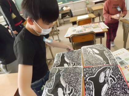 取り組んでいる版画の版が彫れた人から刷る作業に取り掛かっていました。味のある作品に仕上がっていますね。