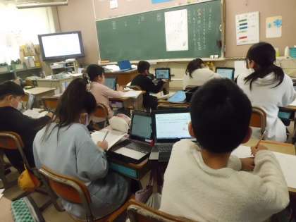 4年2組の国語では、「もしものときにそなえよう」の学習で、「調べたことを整理して伝えたいことをはっきりさせよう。」をめあてに、意見文を書くにあたって「はじめ」「なか」「おわり」を検討していました。