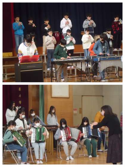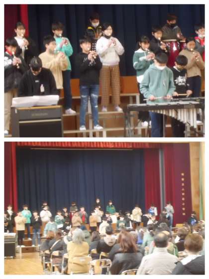 (写真下)2組のクラス合奏曲は、イギリスの作曲家グスターヴ・ホルストが作曲した組曲「惑星」の中でも代表的な管弦楽曲の「木星」です。ゆったりとした壮大な宇宙をイメージしながら演奏していました。