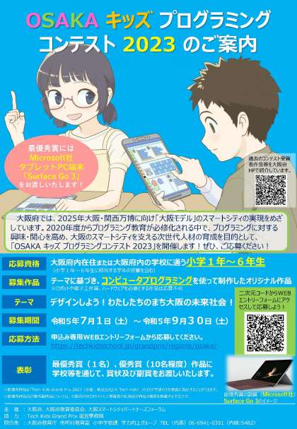 大阪府より、子どもたちのプログラミングに対する興味・関心を高め、次世代人材の育成を図るために小学生を対象に実施するコンテストの案内が届きました。
