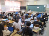 4年1組は図工の学習参観です。「ひみつのすみか」をつくるために、のこぎりを使って木をきる作業を参観していただきました。初めてのこぎりを使う子がほとんどで、緊張感をもって安全に気をつけながら作業していました。