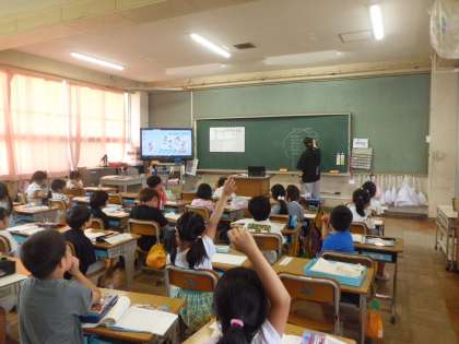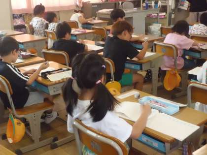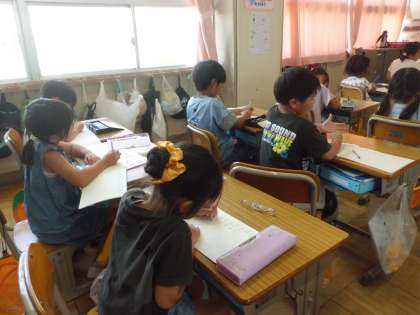 ひき算の学習を進めている1年生。今日は、ひき算になる問題づくりに取組んでいました。「たべました」「つかいました」「あげました」「ちがいは」…など数が減ったり、数を比べたりする具体的な言葉を考えながら、式がひき算になる問題をノートに書いていました。