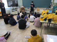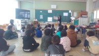 集会室で朝の会の途中に,大阪880万人訓練がありました。命を守るには,窓際から...