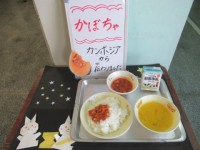 今日の給食のメニューは、ごはん、牛乳、パンプキンポタージュ、セルフチキンライス...
