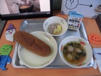今日の給食のメニューは、ごはん、牛乳、パンプキンポタージュ、セルフチキンライス...