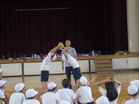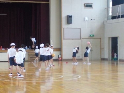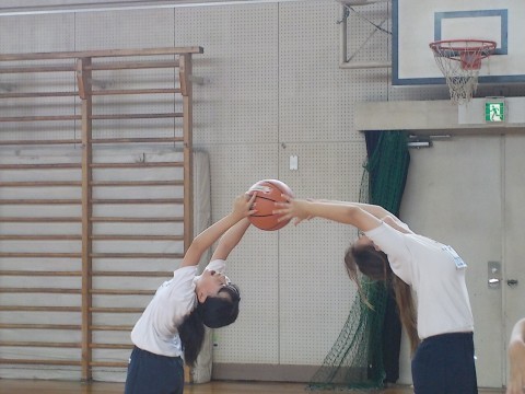 体育では、ボールを使った体つくり運動をペアでしました。