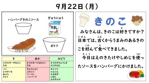 今日は,子どもの好きなハンバーグでした。きのこがたくさん入っていて,秋らしさを感じる一品でした。