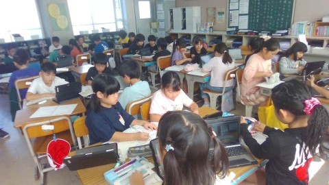 体育の授業では,PCでマット運動の前転を撮影した動画を見て,見るポイントを考えました。