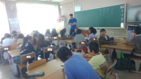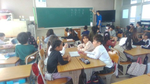 「だれが」「どこで」「なにを」「どうした」を分担して班で考え,つなぎ合わせました。