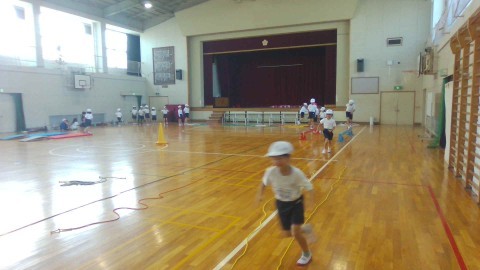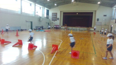 体育では,平均台やフラフープなどを使ってサーキットトレーニングをしています。
