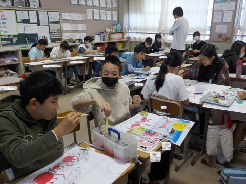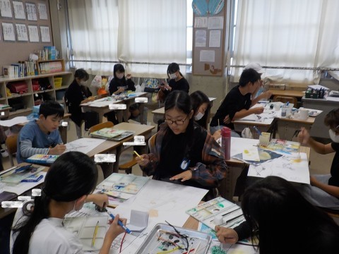 図工では,宮沢賢治の絵本を参考に,色合いや技法などを様々試しながら絵画を創作しています。