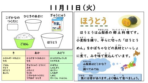 今日の大おかずは,ほうとうでした。「平べったいおうどん」と言う子もいましたが,美味しそうに食べていました。