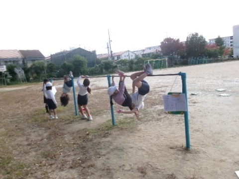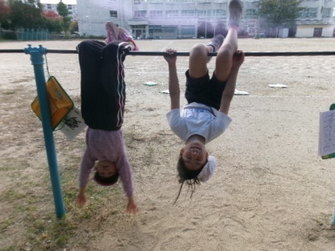 2組は体育をしていました。鉄棒で,いろいろな回り方にチャレンジしていました。
