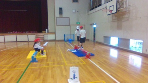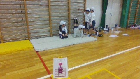 1組の体育では,からだづくりの遊びをいくつかのステージに分かれて企画しています。