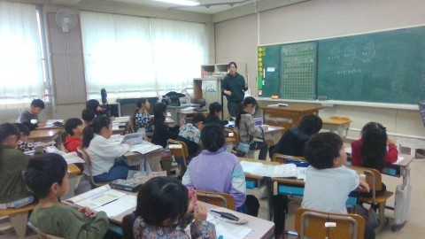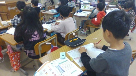 1組の算数では,かけ算の文章題を読んで立式をします。