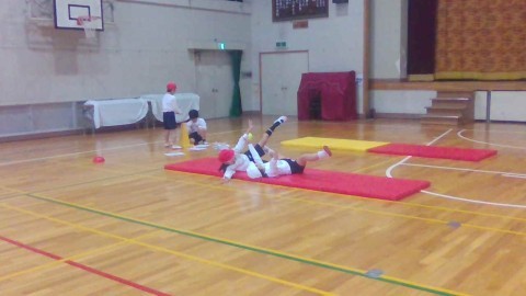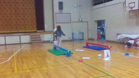 1組の体育では,マットや平均台などを使って,運動あそびをグループに分かれて企画しています。