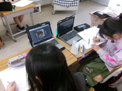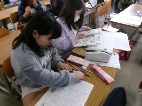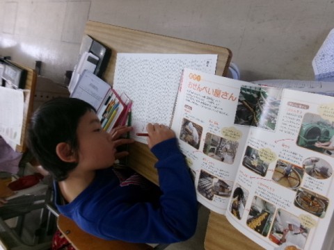 国語の「すがたをかえる大豆」の学習のまとめとして,ほかの食材にも姿が変わる食べ物があることに気づき,調べたり,文章を書いたりしていました。「すがたをかえる〇〇図鑑」を作るそうです。