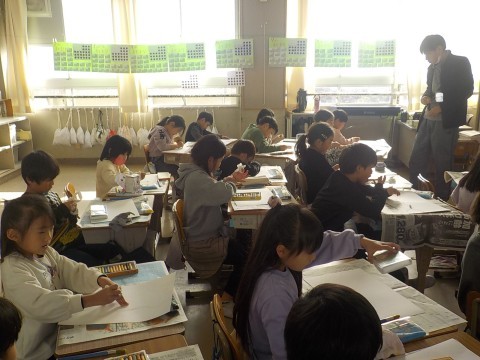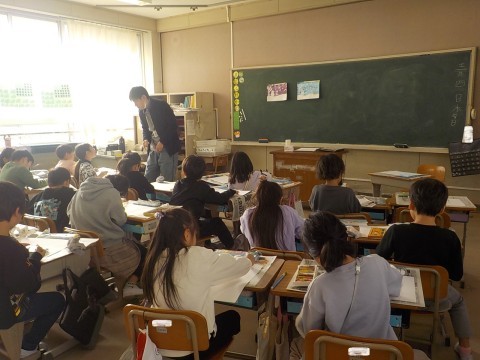 1組の図工では,白色のオイルパステルで雪を表現し,それ以外を水彩絵の具で表現した絵画の制作に取り組み始めました。