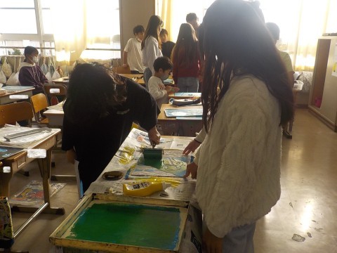 彫刻刀で掘り終えた人から,カラーインクをつけて刷っていました。