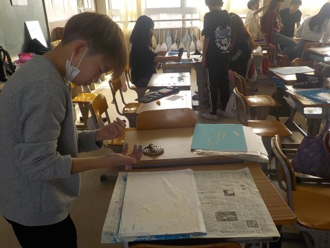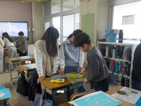 次の色を入れるために,いったん版を洗ってまた次の色を入れて…と根気強く制作しています。