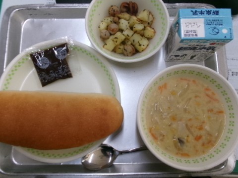 今日はチョコレートクリームがついていて,パンもたくさん食べれそうです。大おかずのクリームスープは豆乳スープで美味しかったです。