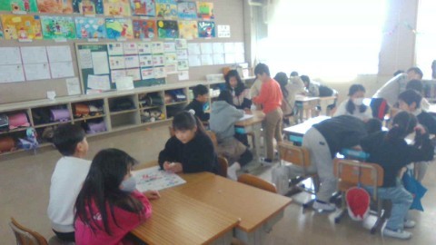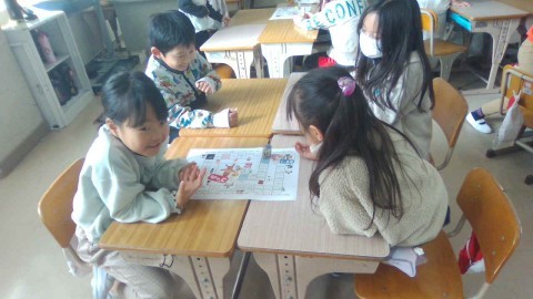 1/8 2年生のようす 公開日 2026/01/08 更新日 2026/01/08 2年生 1組では,お正月の遊び「すごろく」を班で楽しみました。2組では,冬休みの思い出ベスト3をワークシートに書いて,先生がそれをもとに3ヒントクイズを出していました。どちらのクラスも大盛り上がりでした。 +1