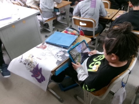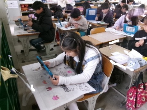 やり残したことをしたり,作品バックに絵を描いたりしていました。一人ひとりのオリジナル作品バックが出来上がっていきました。