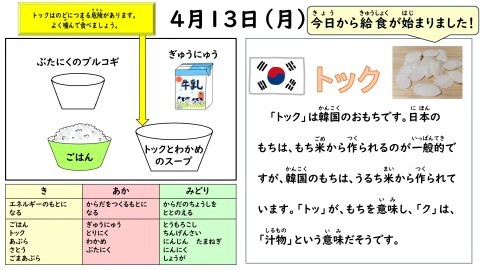いよいよ今年度の給食が始まりました。今日は韓国メニューです。たくさん食べてほしいですね。