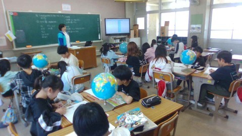 5年2組。社会の勉強で地球儀を見て世界の地図を確認しました。日本はどこかな!