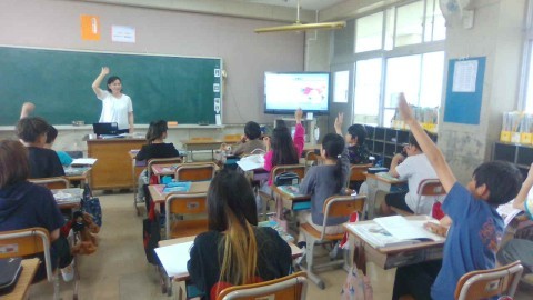 5年1組 社会。地球にある大陸あてクイズをしています。ユーラシア大陸かな・・・。