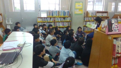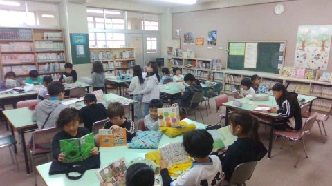 図書の時間。読み聞かせのあと,読みたい本を探して読んでいました。