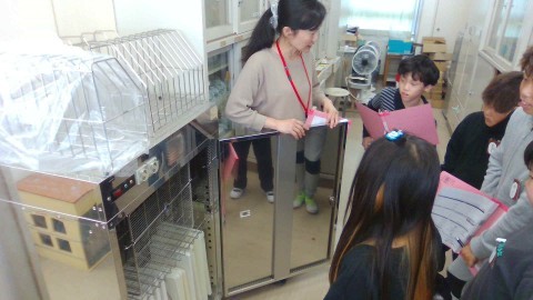 1組。家庭科の授業で使う用具がどこにあるか探しました。冷蔵庫の中に何があるかの確認もしました。