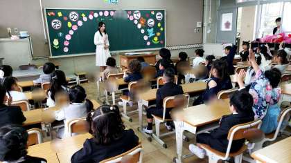 教室で、担任の先生のお話を聞いています。