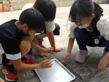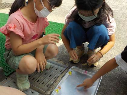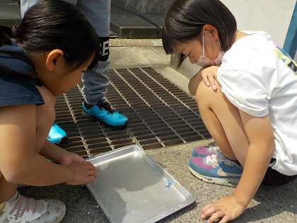 おぼんの上にビー玉を乗せて、どちらに転がっていくかを調べることで水がどの方向に流れるかもわかります。