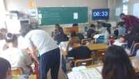 ミシンの縫い方の説明をしっかり聞いていました。