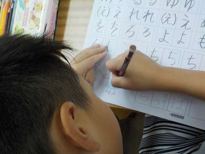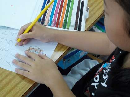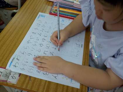 ゆっくり丁寧に文字を書いています。文字を書き終えたら、イラストの色ぬりもがんばります。