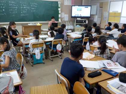 堺市について、グループで調べ学習をしています。堺市のキャラクターの名前で盛り上がっていました。