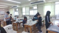 家庭科では,エプロンづくりを進めています。しつけ縫いができた人から,ミシン縫いに...