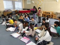 体育館で、学級合奏の練習をしています。最後の一番迫力のある所を合わせています。