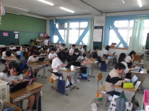 理科「生き物の1年間」の単元テストが行われています。終わった人は、タブレット学習をしています。