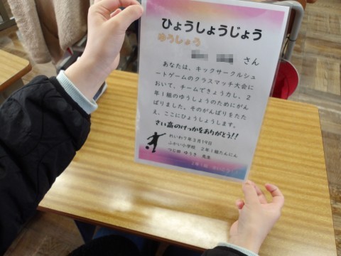 クラスのみんなに、先生から2年生クラスマッチ「キックサークルシュートゲーム」の表彰状が渡されました。みんな嬉しそうです。