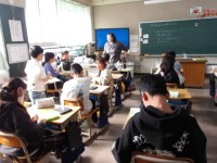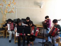 体育大会の団体演技のタイミングを確認しているようです。音楽に合わせて自分のタイミングで立って体で覚えます。