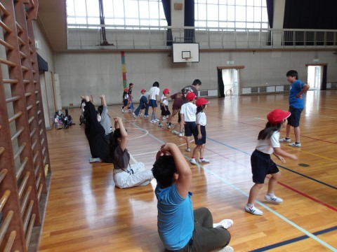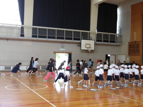 1年生のシャトルランのお手伝いをしています。一緒に寄り添って走っています。