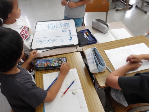 算数では、先生が今日学ぶ問題を黒板に書きます。子どもたちはノートに写した後、読んで思ったことを吹き出しに書きます。出てきた言葉を全体で共有して、今日は何を学ぶのか、子どもたちがめあてにしています。
