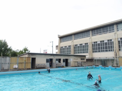 水泳学習をしています。午前中は小雨ですが、今日は、水温のほうが高いので寒さはあまり感じていないようです。クロールの学習をしています。