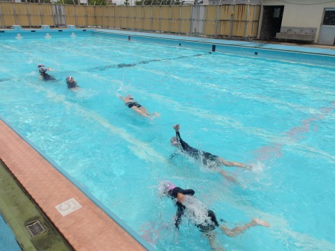 水泳では、バタ足の練習をしています。先生が補助しながら、丁寧に見取っています。